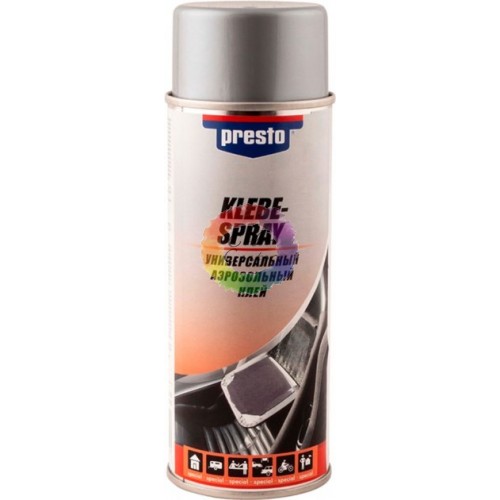 Presto Клей универсальный аэрозольный, 400мл Универсальный аэрозольный клей применяется для склеивания текстиля, пористых материалов, пластмассы, пластика, картона, фольги, резины, металла, дерева, искусственной кожи, меха, ковров.  Надежно склеивает обивку салона, шумоизоляционные покрытия и другие материалы, используемые в автомобилях. Аэрозольная упаковка позволяет работать с крупногабаритными предметами. Ширина распыла регулируется за счет специальной насадки (вертикально/горизонтально). Аэрозольный клей позволяет аккуратно приклеивать поверхности как гладких, так и пористых материалов. После высыхания образует гибкое и прозрачное соединение, устойчивое к воздействию воды. Может использоваться для создания как временного (монтажного), так и долгосрочного склеивания.
