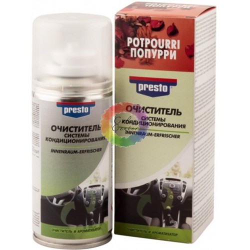 Presto Очиститель системы кондиционирования, поппури, 150 мл — специально разработанный высокоэффективный состав для освежения и очищения систем вентиляции и кондиционирования в автомобилях. Действие препарата направлено на удаление грибков и бактерий. Не рекомендуется к применению в прохладную (ниже +15 °С) или жаркую погоду (выше +20 °С).