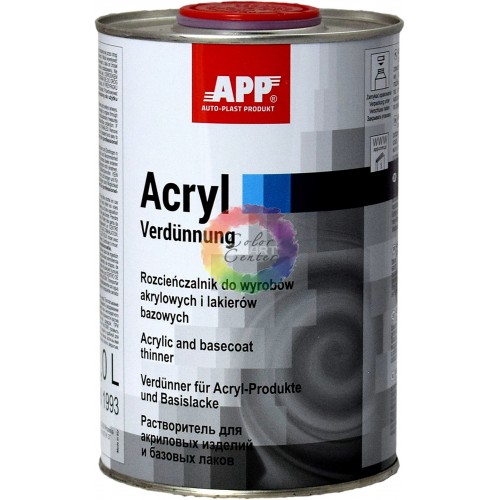 APP 030100 Розчинник для акрилових продуктів та баз, 1л Універсальний розчинник для акрилових фарб, лаків, ґрунтів та базових фарб призначений для зміни консистенції та в'язкості вище названих продуктів. Завдяки можливості вибору між двома видами розчинника: АV8-швидкий та АVN-нормальний, можна оптимізувати час випаровування за різних умов роботи.