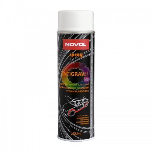 Засіб для захисту кузова Novol Spray Antigravel MS Антигравійне покриття, аерозоль 0,5л – це продукт, що утворює щільну плівку. Нанесений шар має дрібнозернисту структуру та захищає покриття від удару каміння. Засіб також захищає покриття від впливу бензину, масел, води та солей. Має шумопоглинаючі властивості. Грунтується на синтетичних смолах, не містить асфальтів та бітум. Може покриватися будь-якими акриловими лаками.
