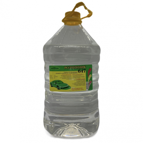 Розчинник 647 - Універсальний розчинник, який застосовується для розведення лакофарбових матеріалів, нітролаків, нітроемалей та подібних продуктів. Основною його перевагою є те, що він жодним чином не впливає на склад та хімічні властивості речовини, яку розбавляють. Даний розчинник стійкий до будь-яких зовнішніх впливів, має здатність витримувати високу температуру. Слід зазначити, що цей розчинник випаровується при взаємодії з повітрям. Тому при його використанні основну увагу слід привернути до виконання всіх правил безпеки. Рекомендується використовувати рукавички, які будуть оберігати руки від шкідливого впливу розчинника, а також організувати циркуляцію повітря в приміщенні або, по можливості, проводити роботи поза приміщенням. Завдяки якісному виготовленню цей розчинник протягом тривалого часу не втрачає своїх основних властивостей.